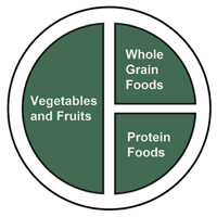 balanced plate is ½ vegetables and fruit, ¼ protein foods and ¼ whole grain foods (see