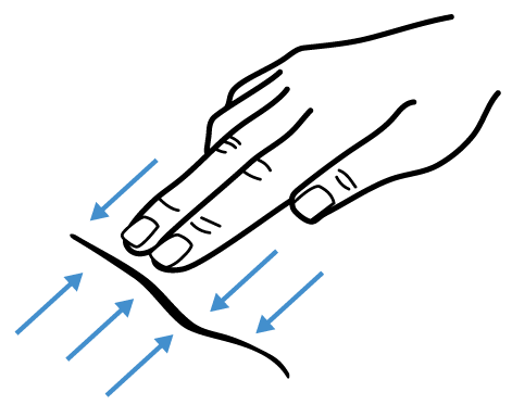 - Place the flat part of your fingers above the scar. Move the skin and the tissue under it downward, towards the scar, but not over it. Hold for a few seconds. Make sure that you press enough to feel the scar “move” under your fingertips.